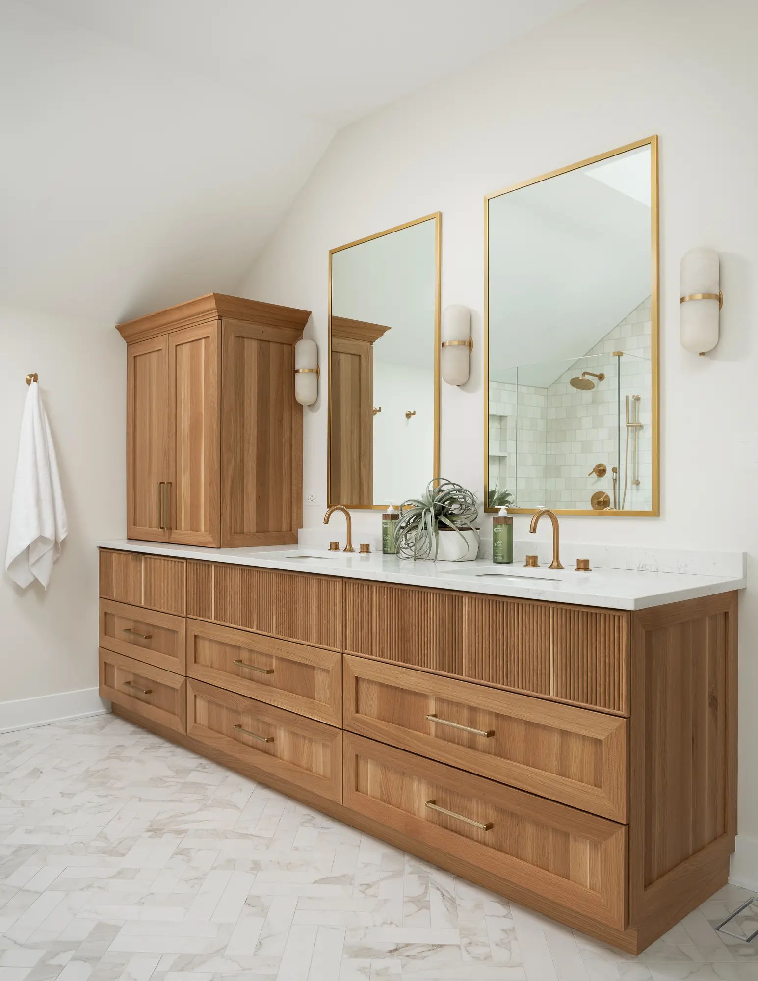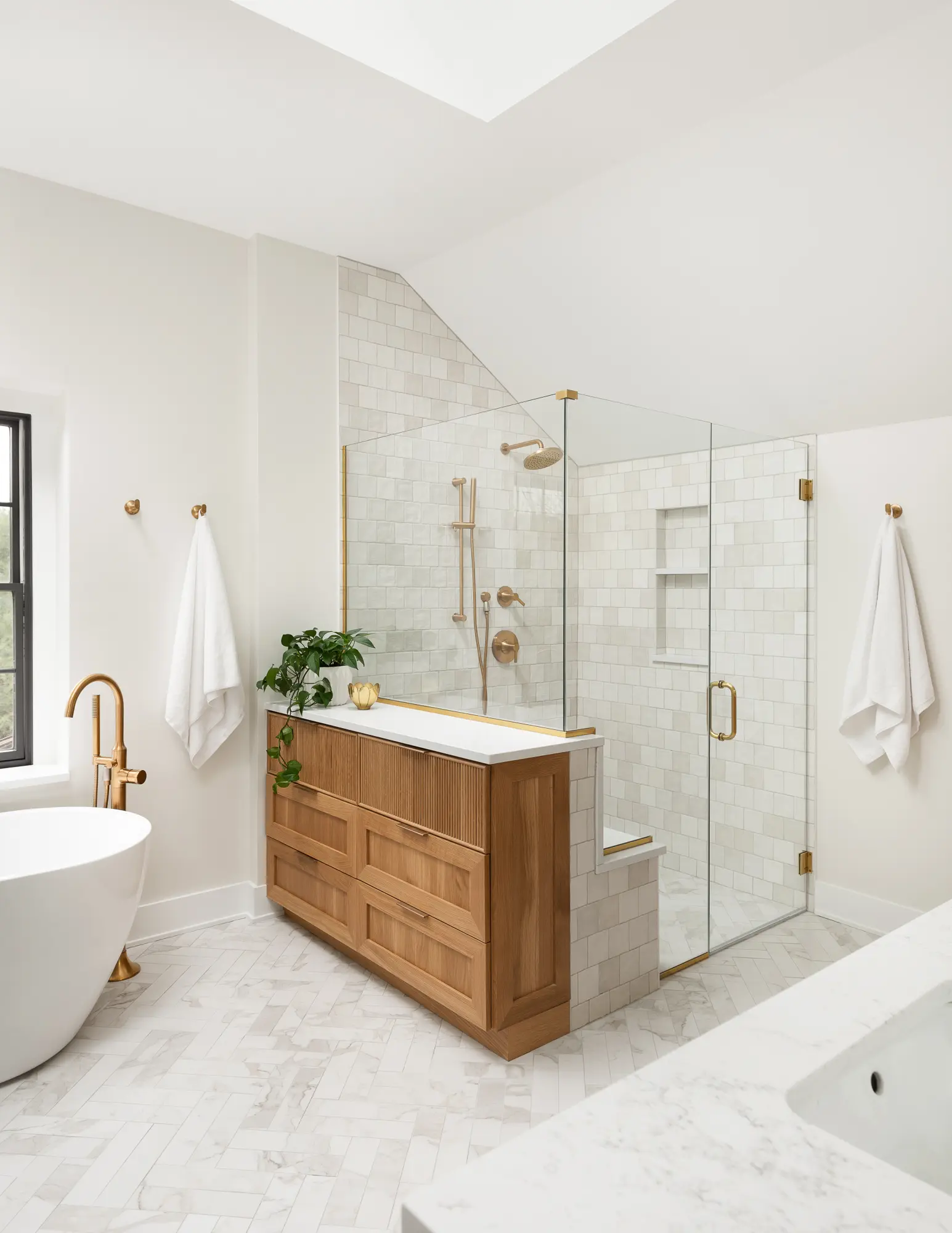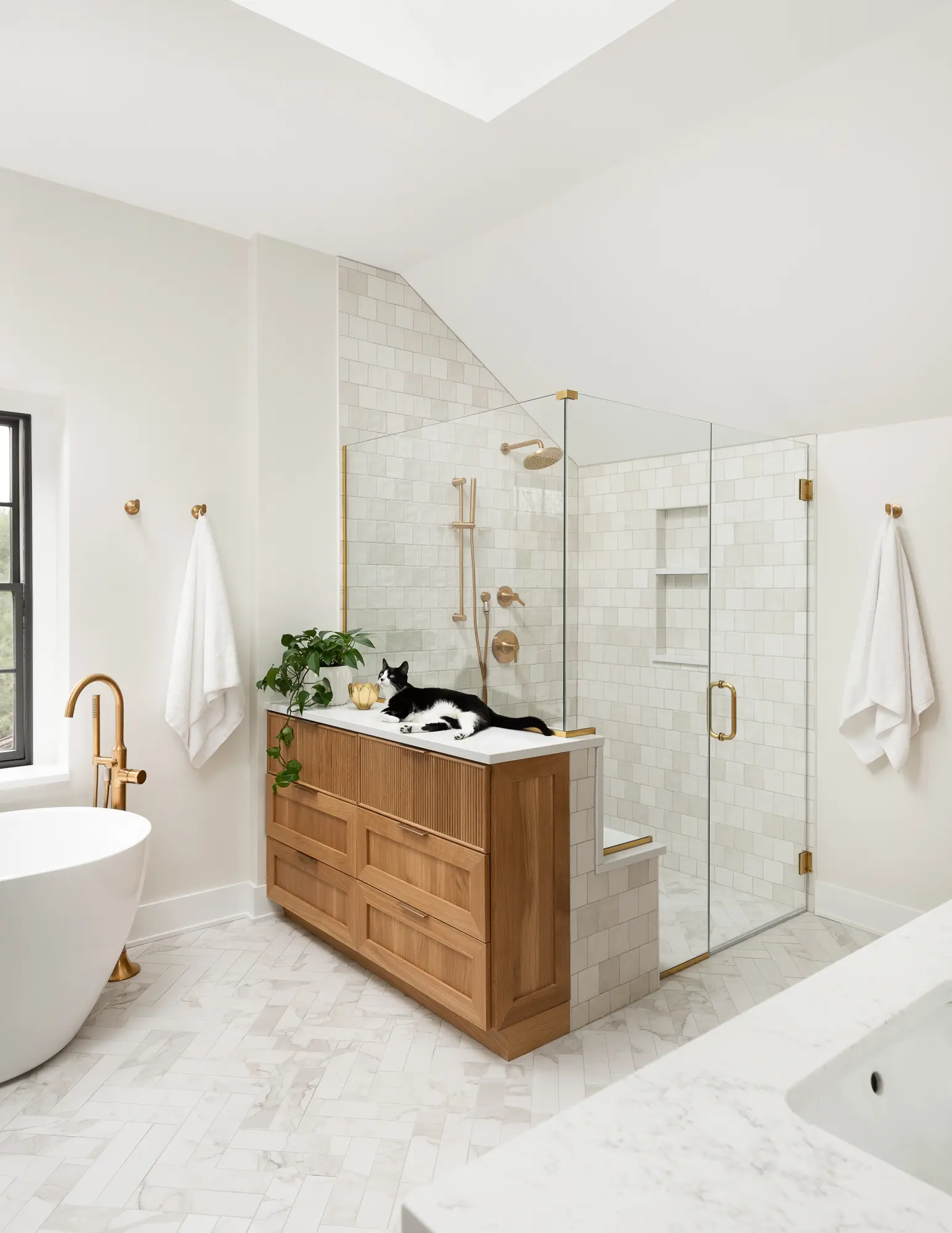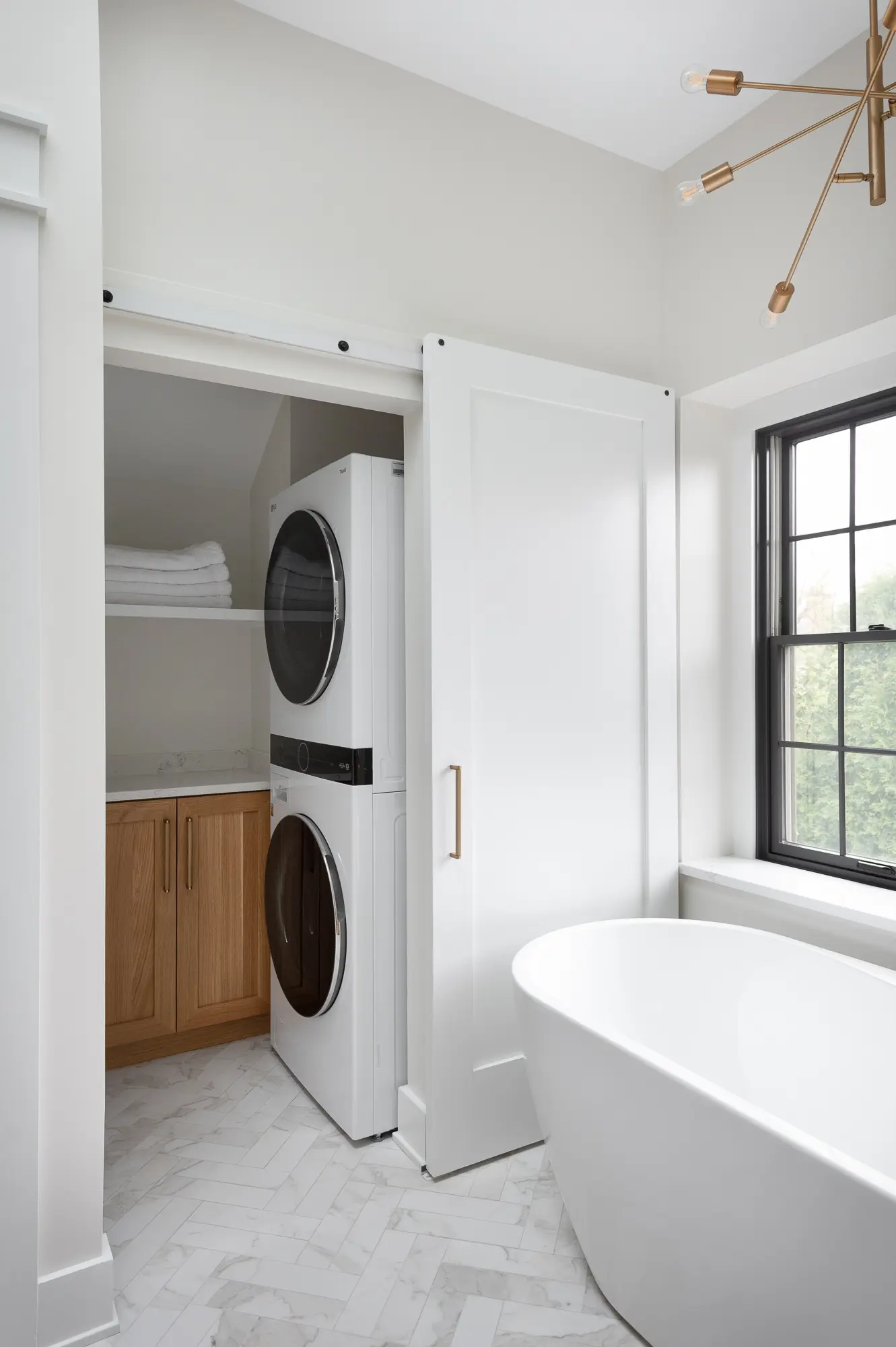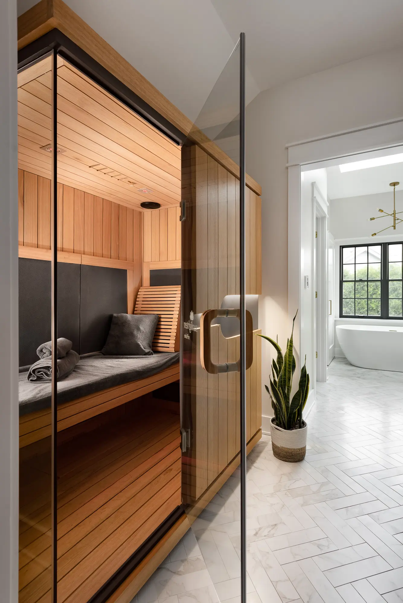 A fully custom bathroom remodel designed to evoke a serene, spa-like retreat. The space features sleek modern cabinetry, a luxurious soaking tub, and a private sauna for ultimate relaxation. Stunning tilework adds texture and visual impact throughout, while a cleverly concealed laundry area blends seamlessly into the design. Every detail is thoughtfully curated to create a calming, high-end oasis within the home.