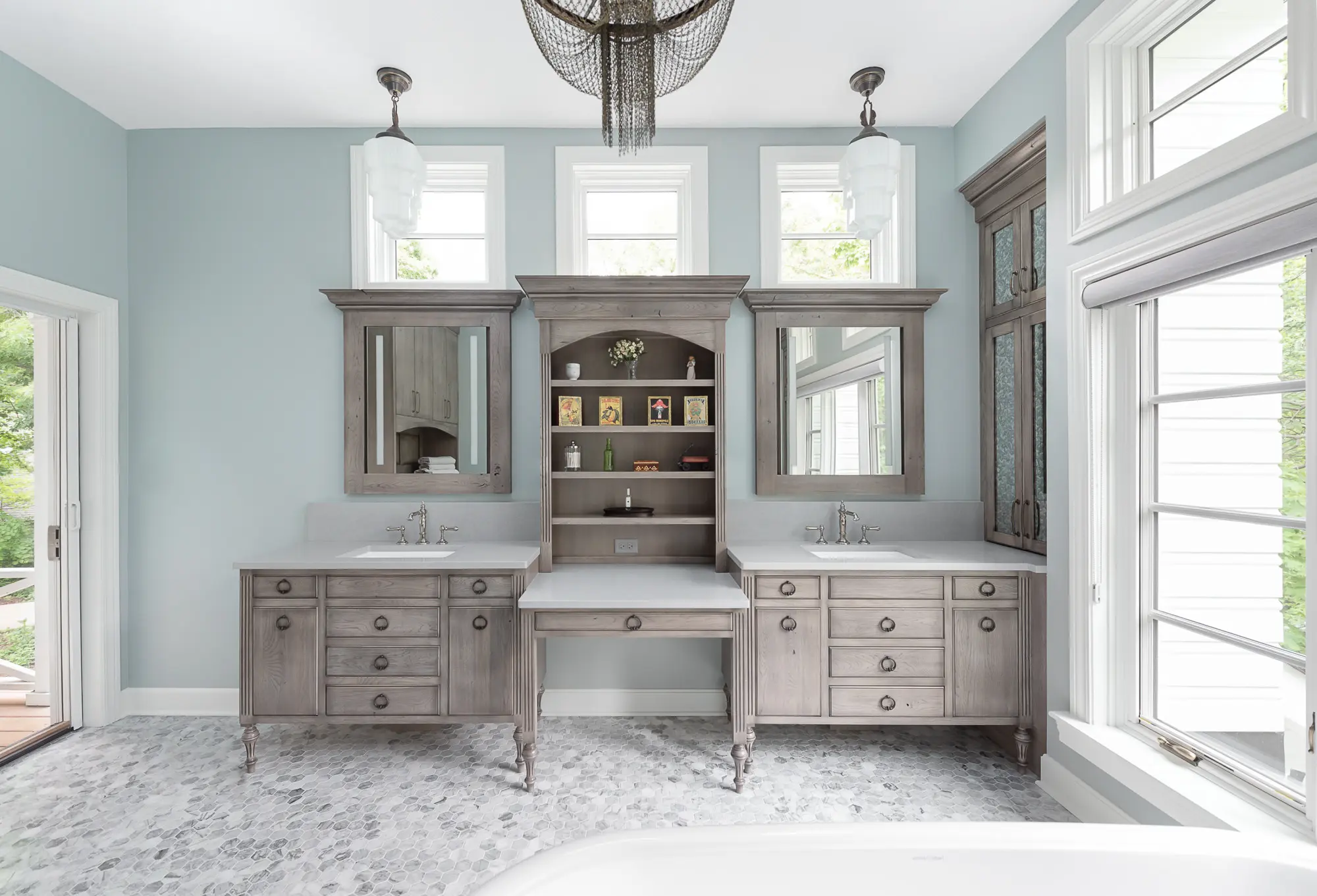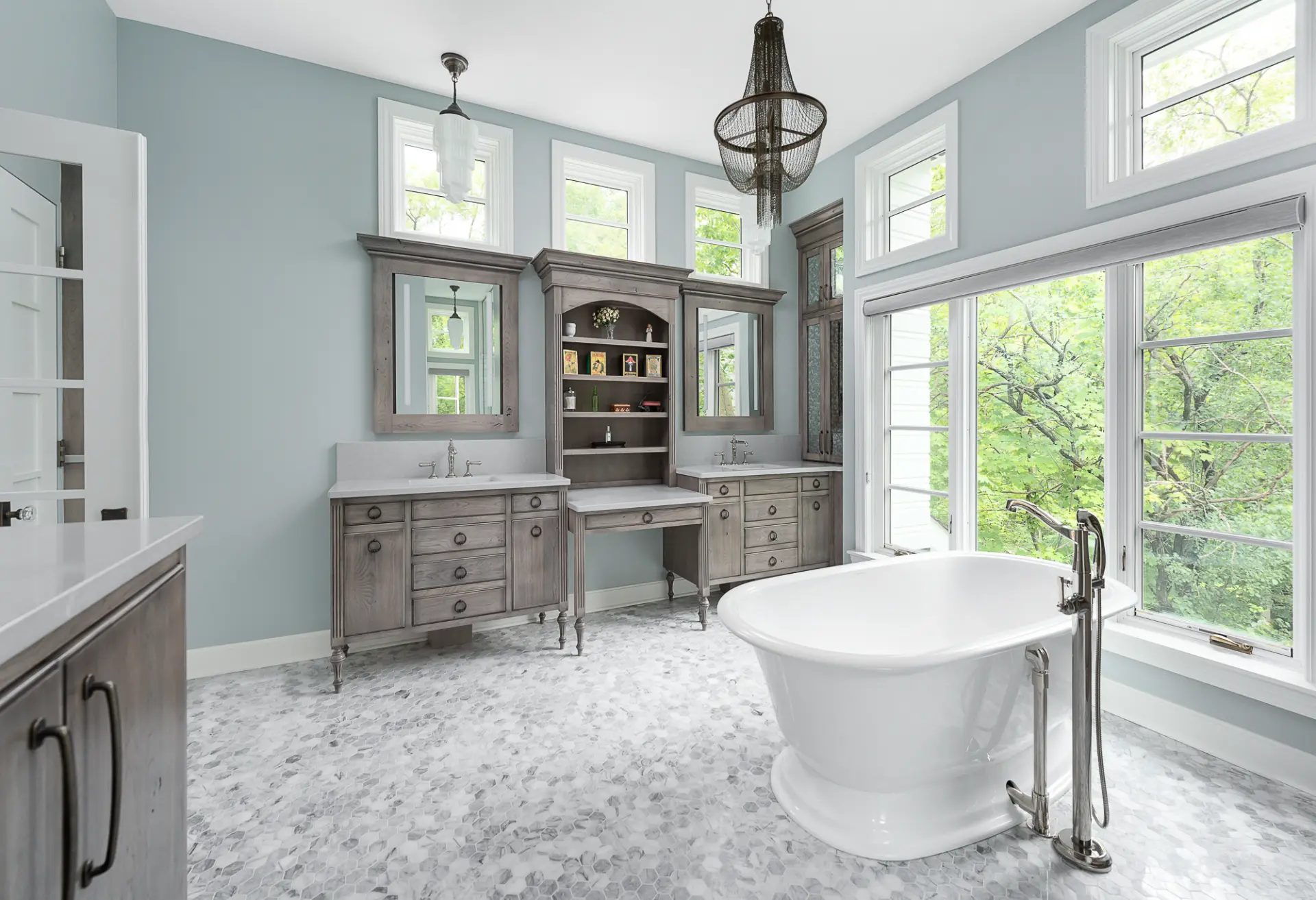 A luxurious primary bathroom remodel featuring high-end selections throughout, including designer lighting that adds warmth and sophistication, premium tilework with intricate detailing, and a freestanding soaking tub that serves as a relaxing focal point. The space is elevated by custom cabinetry tailored for both beauty and functionality, paired with elegant quartz countertops that offer durability and a refined finish. Together, these elements create a spa-like retreat that blends comfort, style, and craftsmanship.